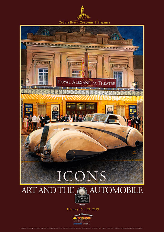 The Canadian International AutoShow with the Cobble Beach Concours d'Elegance has launched a feature of the 2019 AutoShow called "ICONS - Art and the Automobile" in which unique vehicles are presented as works of art. The 2019 inaugural event art features the 1937 Cadillac Series 90 Hartmann Cabriolet from the Patterson Collection. The background is the iconic Royal Alexandra Theatre in downtown Toronto.