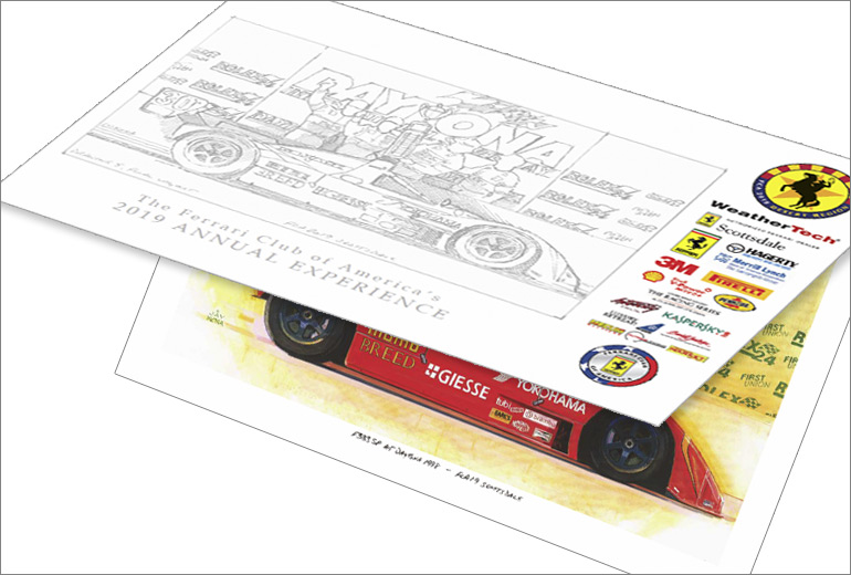 Ferrari Club of America’s 2019 Annual Experience in Scottsdale AZ event artwork. The art has been published as a fine quality numbered and signed print on paper available only through the Ferrari Club of America. Shown above, this version is not available from the Studio.