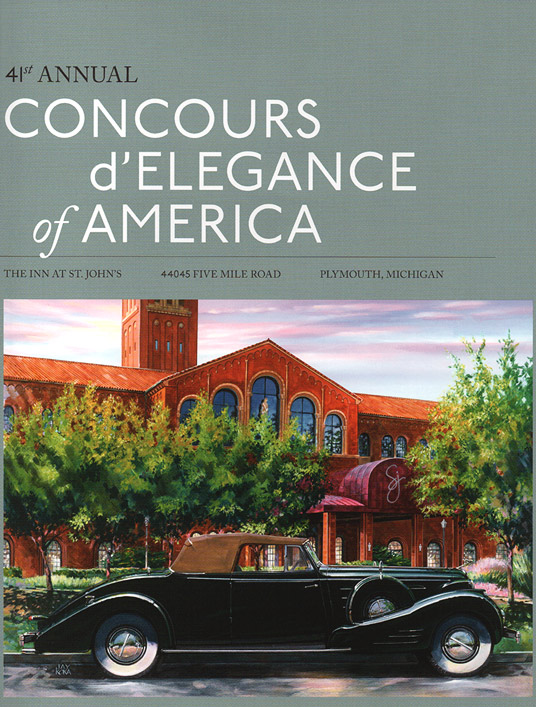 John D Groendyke was named the 2019 Collector of the Year for the Concours d'Elegance of America at St Johns and his 1936 Cadillac V16 Convertible was selected as the poster car. The car is presented in front of the main concours building entrance. This is Jay Koka's fourth original work presented as the poster art for this event.