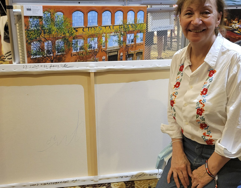 Joanna Villeneuve attended the Mont Tremblant celebration of her late husband's life. She kindly signed and dated the back of the original painting.